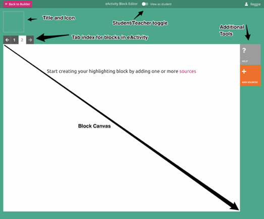 The eActivity Builder (Builder) uses “blocks” as its singular unit to create any activity. Blocks can be set in sequence and can be rearranged as needed. Each block contains a single unit of activity, the sequence of activities is called the eActivity.