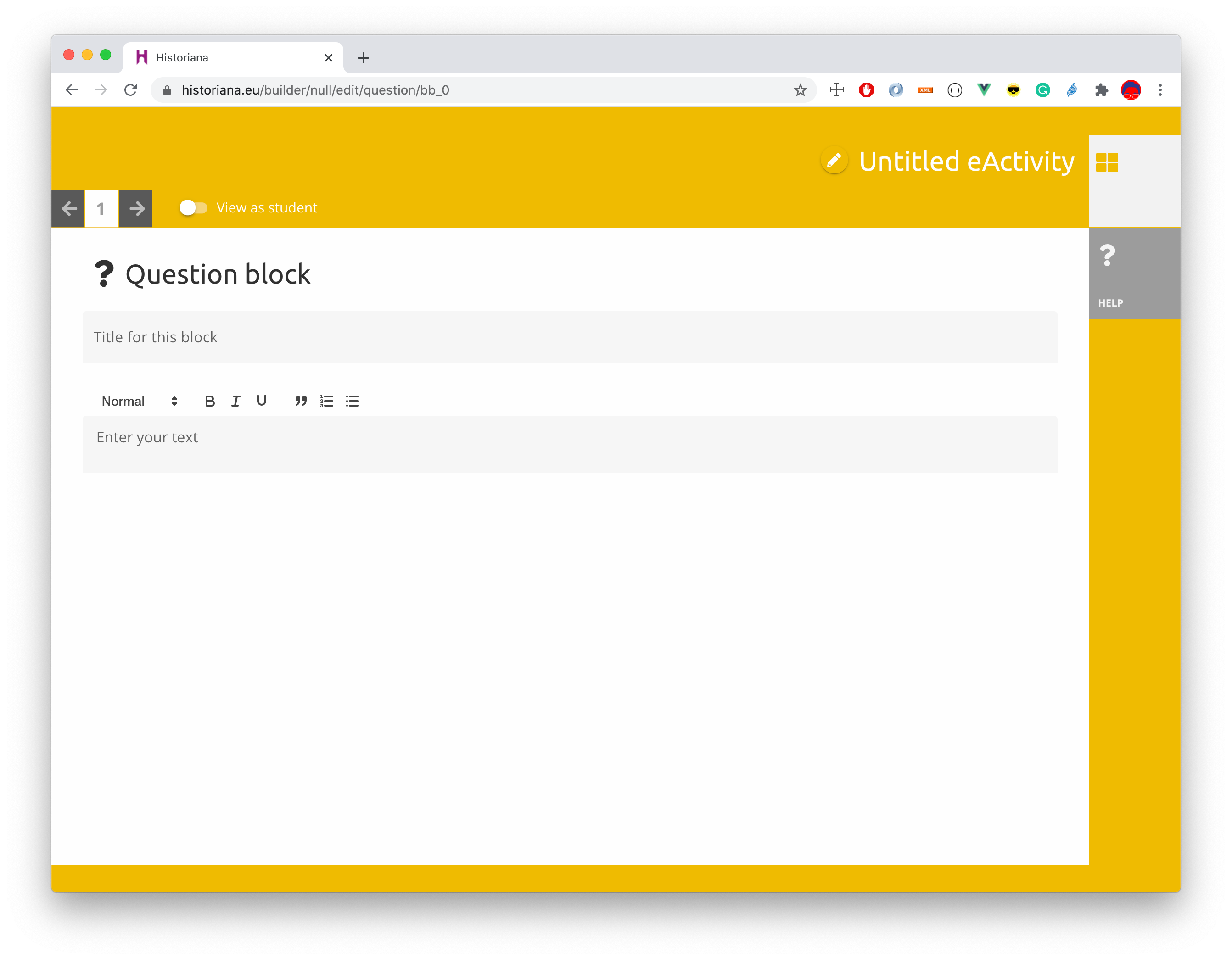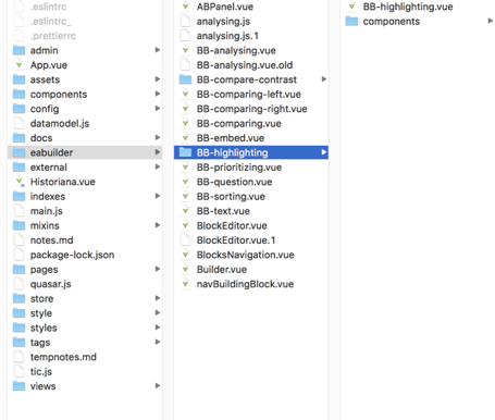 The Historiana project is one big Vue Application, the router determines which part of the code is currently in scope. An active block is either displayed in the builder (BlockEditor) or in the viewer (ea/viewer).
