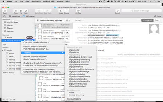 The develop-discovery branch is selected and via Tracking it is connected to origin/develop, the main development branch of the repository. This way changes from the branch develop can be pulled into the local branch.